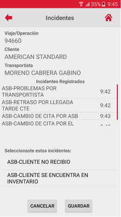 - Si el chofer o transportista desea no asignar los incidentes seleccionados, deberá presionar el botón [No] y esta acción mostrará la pantalla Incidentes con el listado de incidentes ya seleccionados previamente.