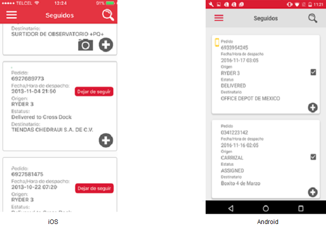Una vez realizada cualquiera de las acciones anteriores, mostraran como resultado la pantalla Seguidos que contiene la lista de pedidos seguidos (ya seguidos con anterioridad y los nuevos) por el usuario en orden alfanumérico descendente con base a la fecha de despacho.