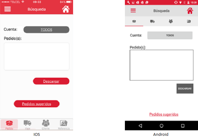 El usuario deberá haber iniciado sesión. La aplicación mostrará la pantalla Búsqueda tipo pedido asignada por default al cumplirse la siguiente condición: