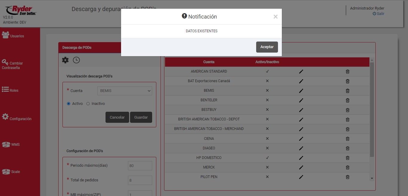• El usuario realiza la selección de una cuenta que ya se encuentra configurada en el listado derecho, al dar clic en el botón [Guardar] se muestra el siguiente mensaje: "Datos existentes". El usuario deberá dar clic en el botón [Aceptar] y desaparecerá el mensaje de alerta.
