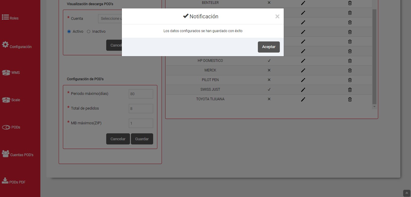 El usuario deberá dar clic en el botón [Aceptar] y se cerrará el mensaje de confirmación exitosa, permaneciendo el usuario en la pantalla correspondiente en donde podrá visualizar los nuevos valores de la configuración establecida.
