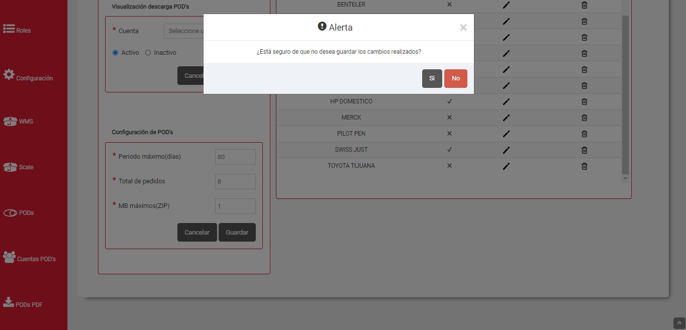 En caso de que el usuario no deseé realizar o concluir el guardado de los nuevos valores de configuración, deberá dar clic en el botón [Cancelar] se mostrará el siguiente mensaje de alerta: "¿Está seguro que no desea guardar los cambios realizados?"
