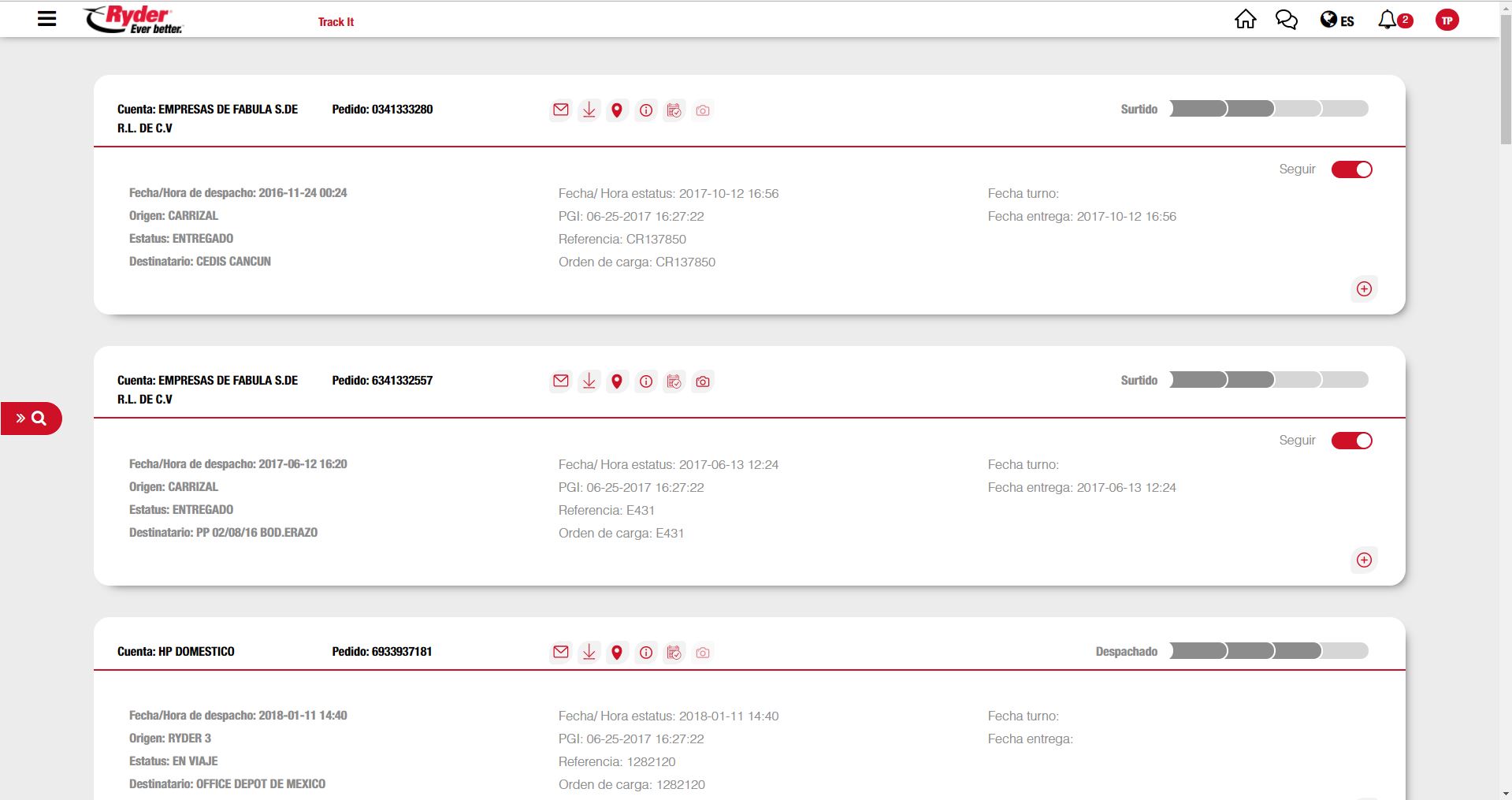 Se mostrará la lista de pedidos que el usuario sigue manual y/o automáticamente los cuales también se encontrarán visibles en la sección "Mis resultados" sobre el menú lateral, en caso de que el usuario desee dejar de seguir el pedido deberá dar clic sobre el switch "Seguir" y automáticamente desaparecerá de la lista de "Seguidos". El usuario podrá acceder a las siguientes acciones de los pedidos: Visualizar el mapa del pedido, consultar sus incidentes, consultar sus eventos, consultar la prueba de entrega (POD), consultar el resto de la información relacionada al pedido, compartir información del pedido por correo, descargar PDF del pedido, opción para seguir el pedido, visualizar los viajes y acceder a las funciones propias de cada viaje.