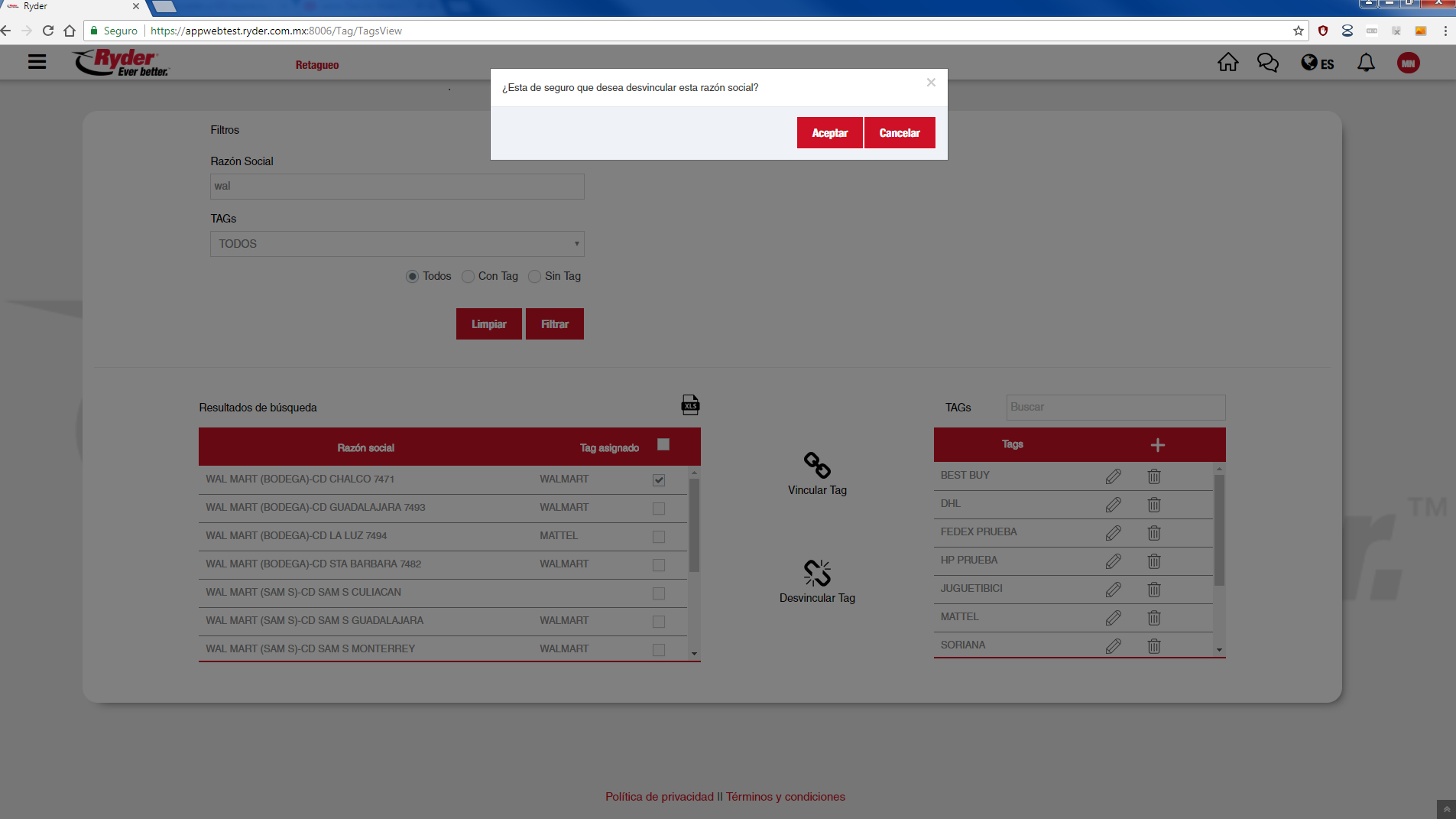 El usuario podrá desvincular unouna o variosvarias tagsrazones alsociales, seleccionarseleccionando la o las razones sociales adeseadas, desvincularya y hacer clic que clic en el botón [Desvincular Tag], visualizándose un mensaje con las opciones "Si" para confirmar la acción de desvincular y "No" para que el usuario cancele la acción de desvincular.
