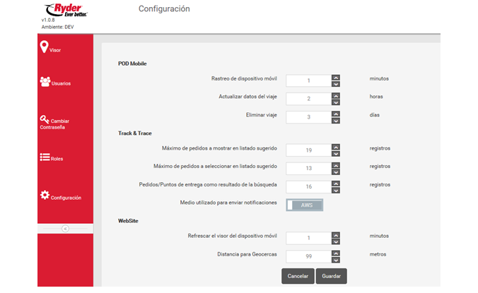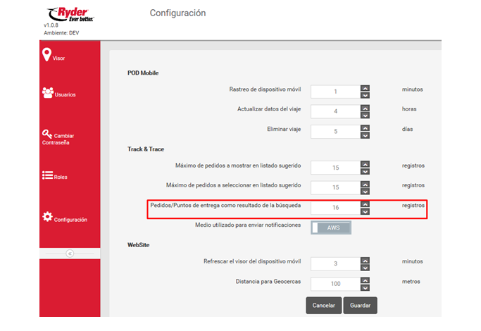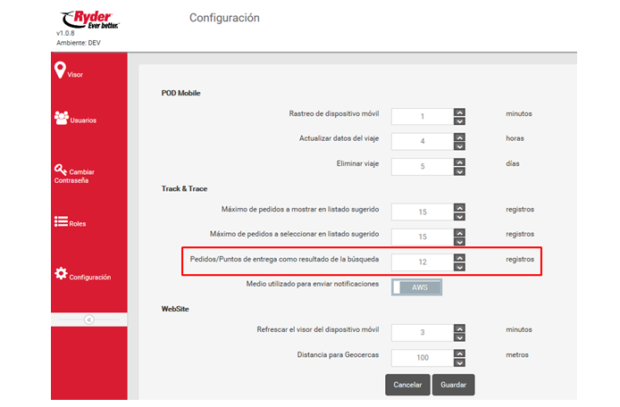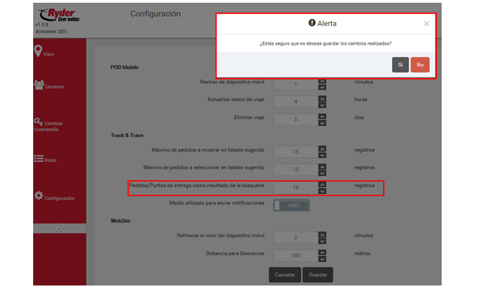 El usuario deberá seleccionar o capturar la cantidad de registros de pedidos y puntos de entrega que el usuario de la aplicación podrá visualizar como resultado de la búsqueda en la aplicación Ryder Track & Trace y después deberá dar clic en el botón [Guardar] y esta acción muestra la siguiente notificación: