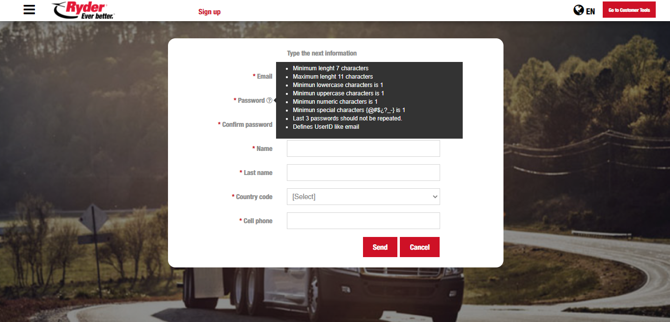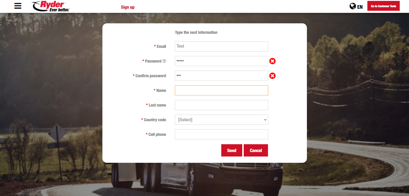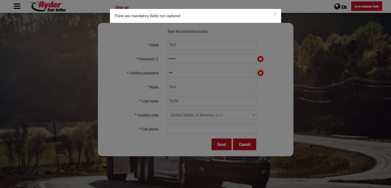 Once done, the user clicks "Send" and the application will validate that all required fields have information.