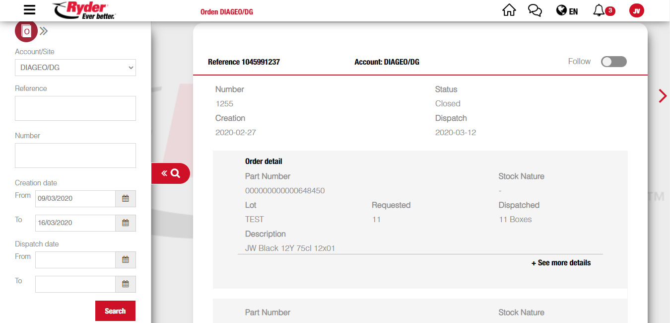 The user may click the "See more details" option and "Series Number", "LPN", and "Lot" information will be displayed, according to the settings in the console. When clicking in "See less" the displayed information will collapse.