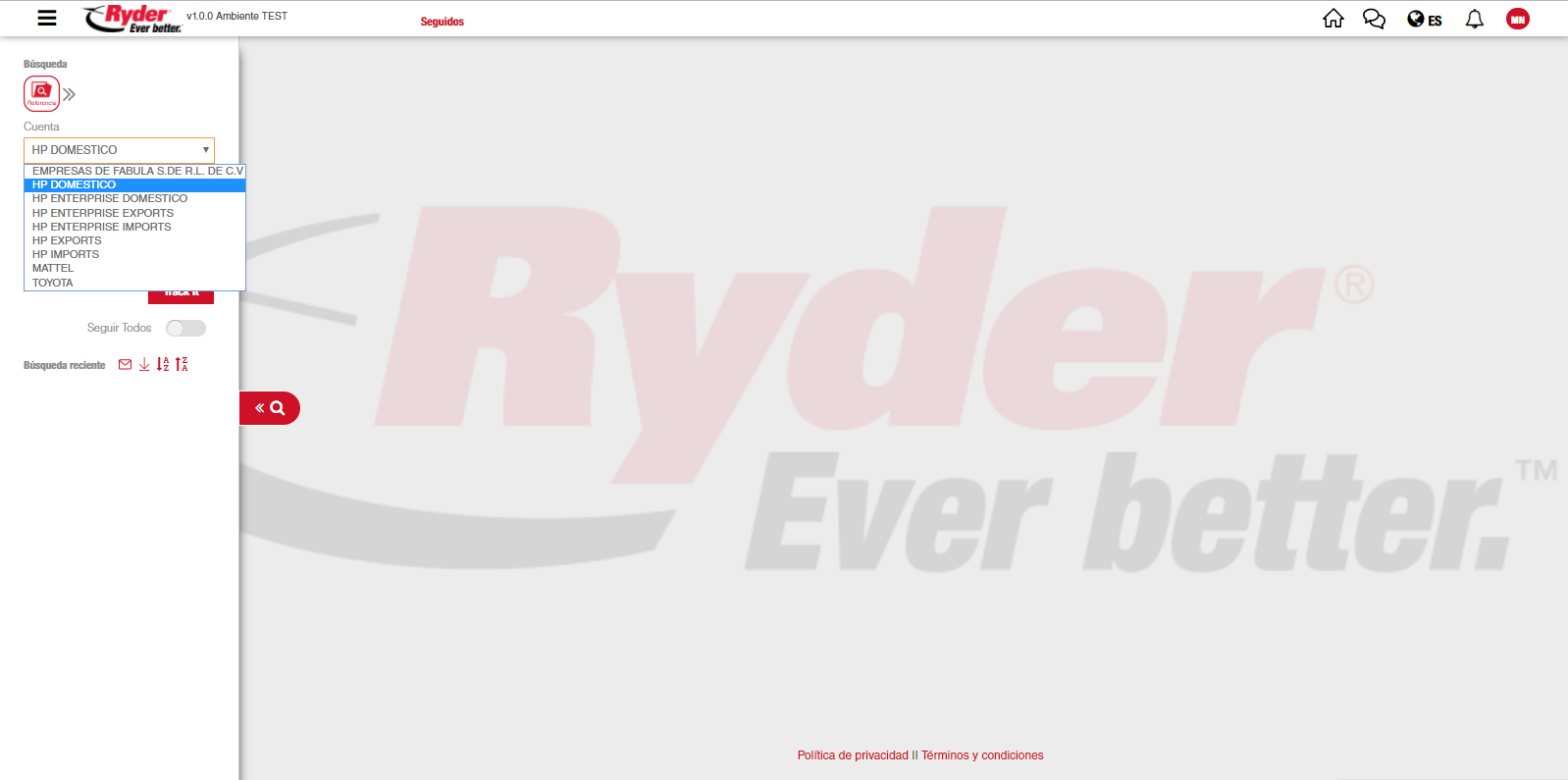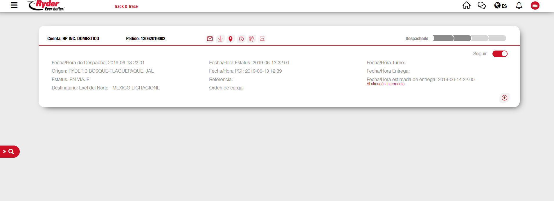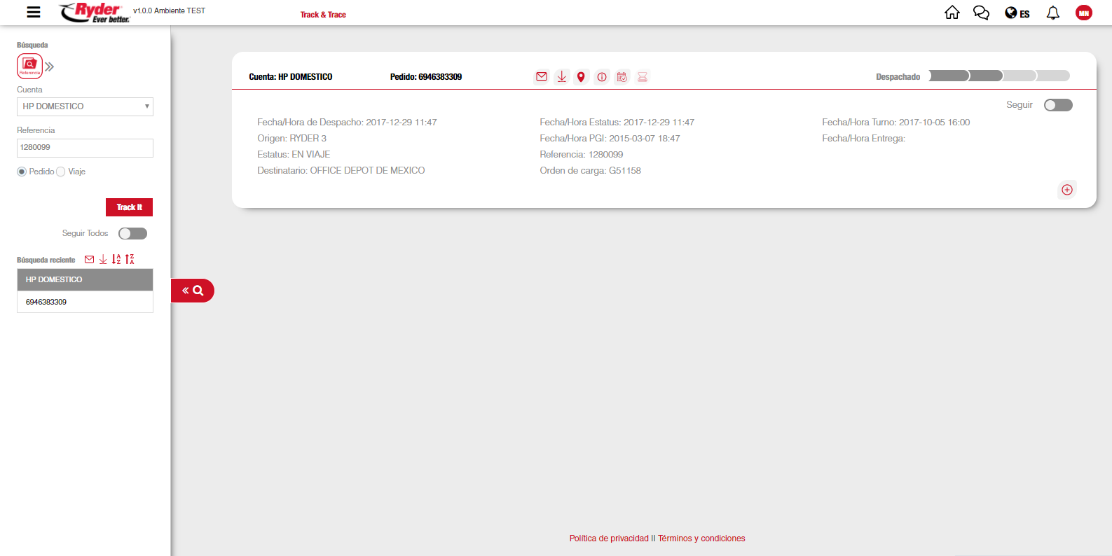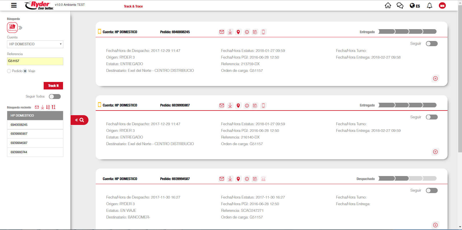 Una vez que el usuario ha seleccionado una cuenta y capturado un número de referencia, deberá dar clic en el botón [Track it]. Se mostrará la información correspondiente al pedido, en donde por cada pedido se mostrará una ficha técnica con su información más relevante y los iconos donde podrá realizar las siguientes acciones: visualizar el mapa del pedido, consultar sus incidentes, consultar sus eventos, consultar la prueba de entrega (POD), consultar el resto de la información relacionada al pedido, compartir información del pedido por correo, descargar PDF del pedido y opción para seguir el pedido. Los resultados de la consulta también se mostrarán en la sección "Búsqueda Reciente", agrupados por cuenta sobre el menú lateral.